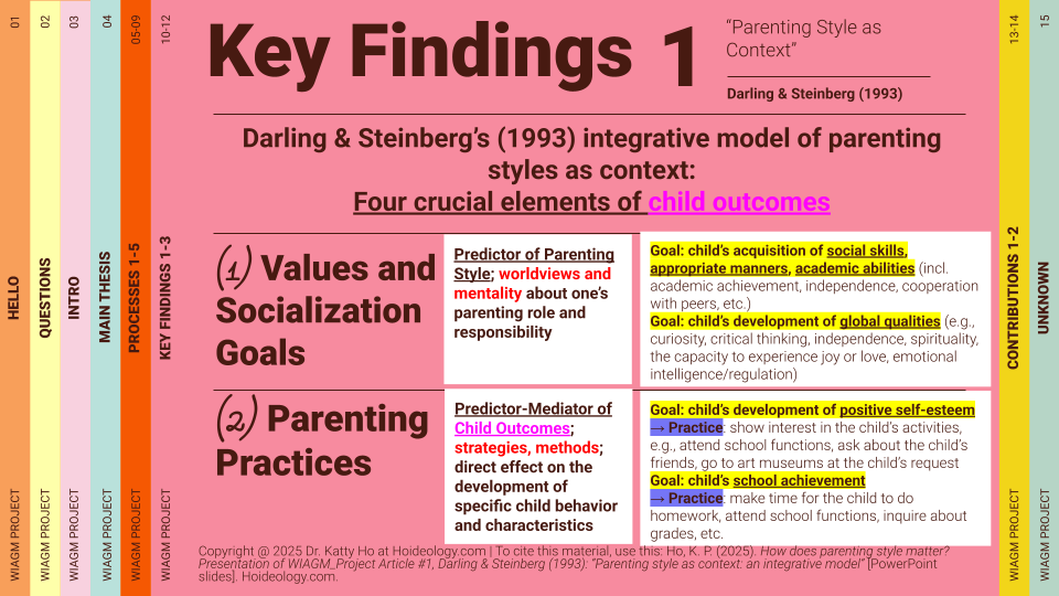 - Copyright @ 2025 Dr. Katty Ho at Hoideology.com | To cite this material, use this: Ho, K. P. (2025). How does parenting style matter? Presentation of WhatIsAGoodMother_Project Article #1, Darling & Steinberg (1993): “Parenting style as context: an integrative model” (Parenting Literature Review & Applications, Season 1, Episode 1) [YouTube Video]. Hoideology.com. https://youtu.be/q1edJmE7Kqc?si=EiGJPfdRvmgL-LJy
